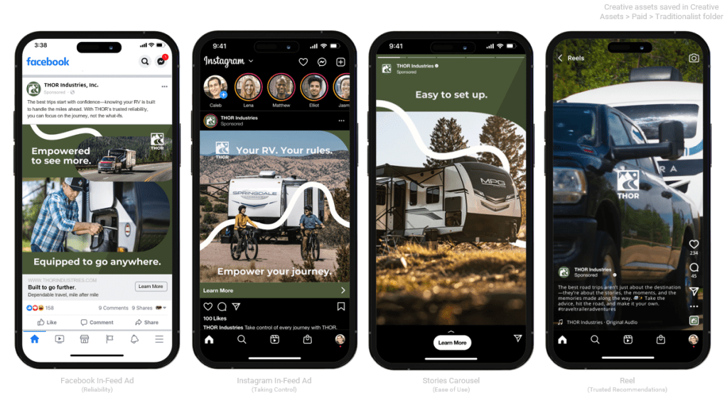 The Outcome: The client was impressed with how a singular concept was adapted for a wide variety of market segments, from B2B RV dealers to B2C micro-segments of the RVing audience. The social strategy employed recommended KPIs to follow social engagement further down the sales funnel.